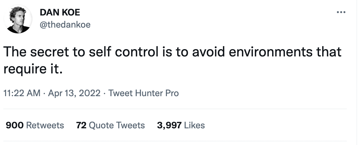 πͺπ»Achieve outcome by avoiding badTemplate:The secret to {difficultThing} is to {avoidNeedCompletely}Sample:The secret to self control is to avoid environments thatrequire it.