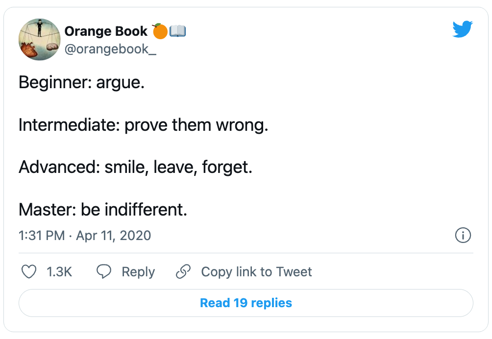 💪🏻Beginner to master in topicTemplate:Stages of {Topic}Beginner: {BeginnerVibe}Intermediate: {IntermediateVibe}Advanced: {AdvancedVibe}Master: {MasterVibe}Sample:Beginner: argue.Intermediate: prove them wrong.Advanced: smile, leave, forget.Master: be indifferent.
