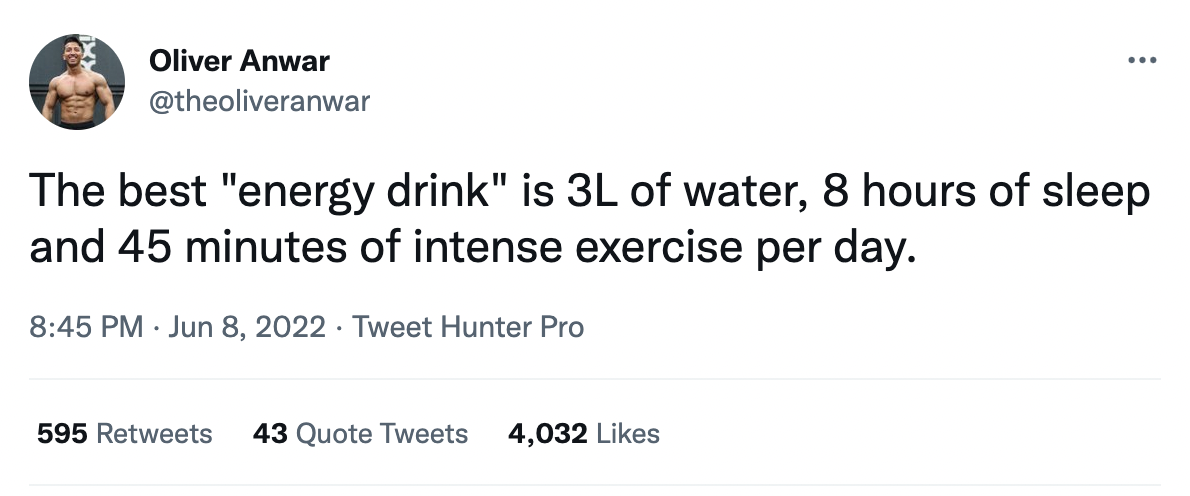 💪🏻The best 3 “hacks”Template:The best "{hack}” is {3 principles}Sample:The best “energy drink” is 3L of water, 8 hours of sleep and 45 minutes of intense exercise per day.